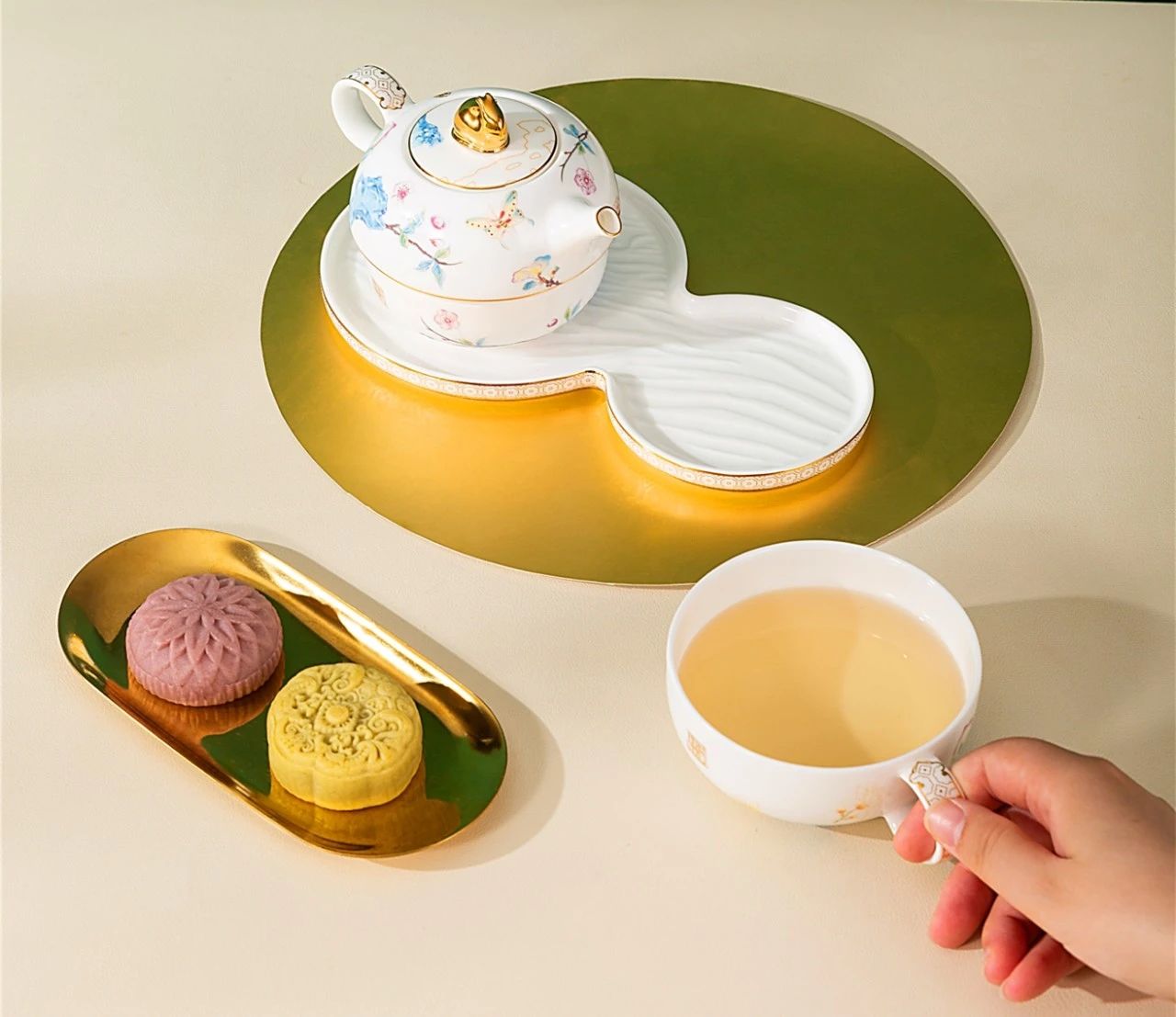 《春华》悦途茶具选用高品质骨质瓷,摒弃厚重感,带来独有的通透,且更易散发茶香。玉兔形盖钮,生动可爱,寓意美好。配套杯碟,除了隔热,也可单独盛放茶歇小食。茶具多处绘饰手工描金,于细微处彰显匠心和质感!