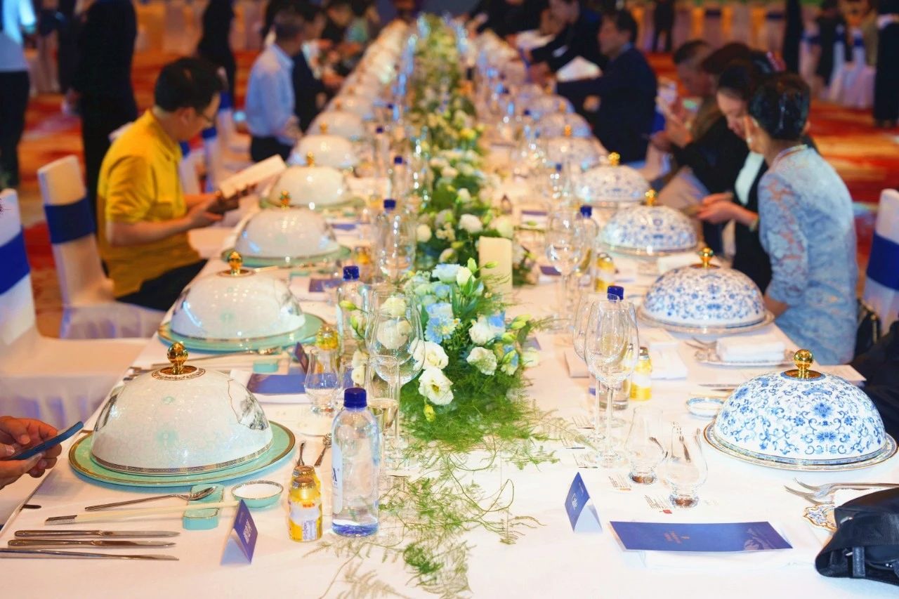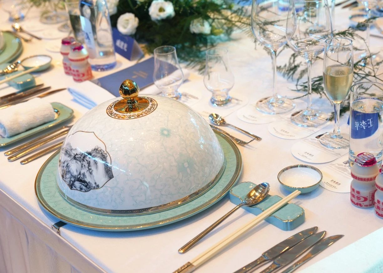 在峰会晚宴上,高淳陶瓷承制的盛世如意青花系列及丝路系列宴会餐瓷亮相现场,进一步展现了晚宴庄重的仪式感。