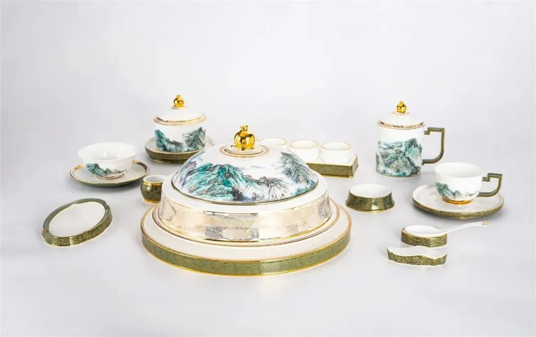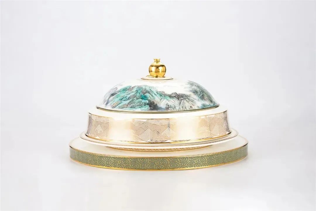 山水秦韵系列冷菜盖由庄志诚等设计师开发,设计语言以 “圆”展开,寓意圆融圆满、万众同心、逐梦圆梦。花面采用“中华龙脉-秦岭”为主装饰,以青绿山水形式表达;盖顶的设计融入 “石榴”元素,表达出“同心同行”的主题。